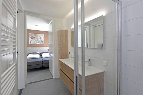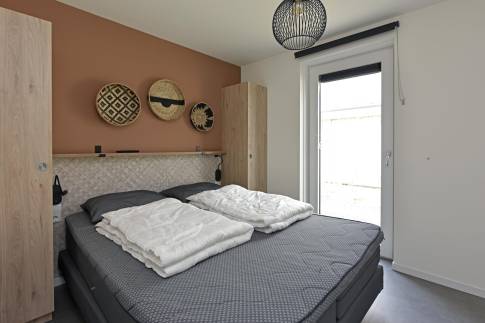 De woning telt twee comfortabele slaapkamers, elk voorzien van royale bedden en voldoende kastruimte. Hier kom je volledig tot rust na een actieve dag in de buitenlucht. De moderne badkamer is luxe uitgevoerd met een ruime inloopdouche, dubbele wastafel en hoogwaardige afwerking. Een separaat toilet zorgt voor extra comfort.