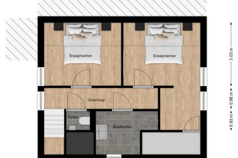 De bovenverdieping verrast met twee ruime slaapkamers, beide licht en praktisch ingedeeld. Via de overloop bereik je tevens een separaat toilet en een moderne badkamer, uitgerust met een inloopdouche, glazen wand, wastafelmeubel en handdoekradiator. De grootste slaapkamer beschikt over een extra inbouwkast – handig voor kleding en persoonlijke bezittingen.