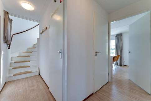 Bij binnenkomst word je verwelkomd in een ruime hal die toegang biedt tot het toilet, de trap naar boven en de woonkamer. Zodra je de living instapt, valt de zee van licht en ruimte direct op. Grote ramen en openslaande deuren zorgen voor een prachtig uitzicht op de tuin en het water, waardoor binnen en buiten naadloos in elkaar overlopen. De woonkamer biedt volop ruimte voor een gezellige zithoek en een royale eettafel, perfect om samen te komen met familie en vrienden.
