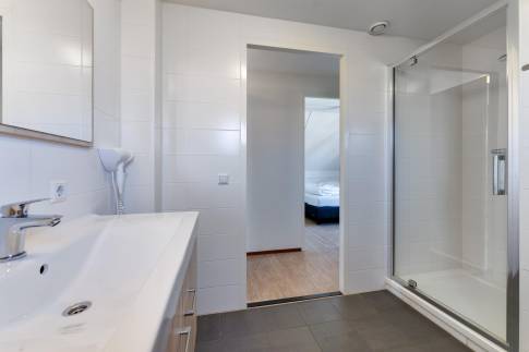 Op de begane grond bevindt zich bovendien een comfortabele slaapkamer met eigen badkamer. Dankzij de inloopdouche en het moderne wastafelmeubel is dit een volwaardige suite, perfect voor logees of om zelf gelijkvloers te wonen.