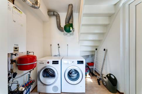De open keuken sluit hier stijlvol op aan en is voorzien van moderne inbouwapparatuur. Of je nu uitgebreid kookt of snel een hap bereidt, alles is binnen handbereik. Aangrenzend vind je een praktische bijkeuken met aansluitingen voor wasmachine en droger en een extra buitendeur – ideaal na een dag strand of voor het opbergen van tuinspullen.