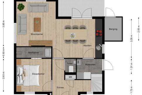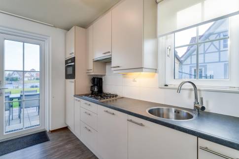 Aansluitend aan de keuken bevindt zich een praktische bijkeuken, bereikbaar vanuit zowel de woning als de tuin. Hier is ruimte voor de opstelling van wasmachine en droger en extra bergruimte. Deze ruimte verhoogt het dagelijkse gebruiksgemak en is bovendien ideaal bij recreatieve verhuur, doordat functionele voorzieningen discreet uit het zicht blijven.