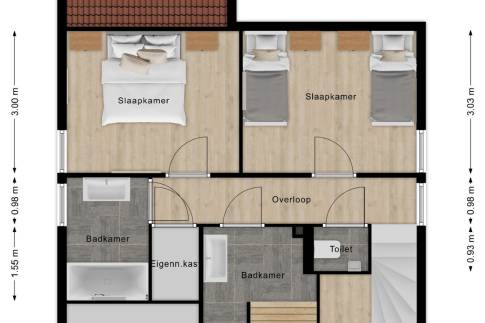 Via de vaste trap bereikt u de ruime en overzichtelijke overloop, die toegang biedt tot twee volwaardige slaapkamers, een separaat toilet en twee comfortabel ingerichte badkamers. Beide slaapkamers beschikken over voldoende lichtinval en bieden ruimte voor een tweepersoonsbed en kastruimte, waardoor zij uitstekend geschikt zijn voor zowel gezinsgebruik als gastenverblijf.
