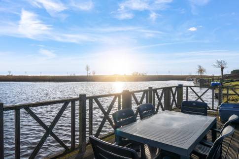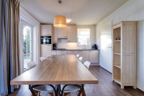 De woonkamer is licht en ruim opgezet en staat in open verbinding met de keuken, waardoor een aangename leefruimte ontstaat met prettige zichtlijnen naar de tuin en het water. De vloer is afgewerkt met een onderhoudsvriendelijke pvc-vloer en draagt bij aan de rustige, verzorgde uitstraling van het interieur. De moderne keuken is compleet uitgevoerd met inbouwapparatuur en biedt volop werk- en kastruimte, geschikt voor zowel dagelijks gebruik als uitgebreid koken. Via de openslaande tuindeuren loopt u direct door naar het overdekte terras, waardoor binnen en buiten op natuurlijke wijze met elkaar worden verbonden.