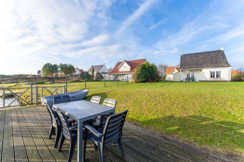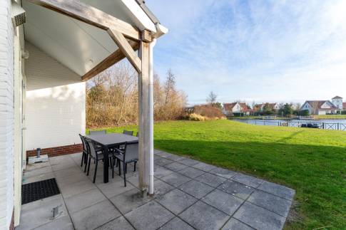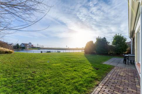 Rondom de woning ligt een verzorgde en onderhoudsvriendelijke tuin met meerdere terrassen. De achtertuin is gesitueerd op het noordoosten en grenst direct aan een waterpartij, wat zorgt voor een open en rustige ligging met veel privacy. De terrasoverkapping maakt het mogelijk om vrijwel het hele jaar door buiten te verblijven.