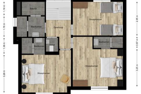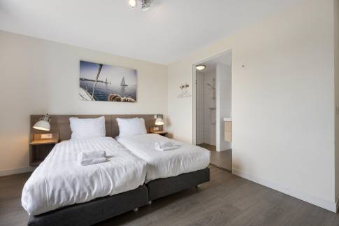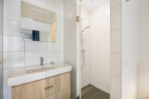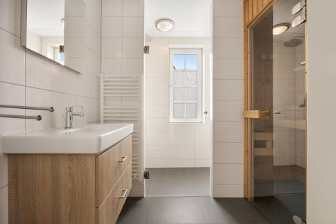 Daarnaast vindt u op deze verdieping een separate toiletruimte én een derde, complete badkamer. Deze is voorzien van een ruime inloopdouche, modern wastafelmeubel én een heerlijke sauna – een perfecte plek om te ontspannen na een lange strandwandeling of een actieve dag buiten.