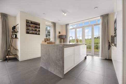 De royale living is een heerlijke plek om te ontspannen, compleet met een sfeervolle gashaard en charmante erker die voor extra lichtinval zorgt. De woonkamer staat in open verbinding met de moderne woonkeuken: een echte blikvanger met een royaal spoeleiland en hoogwaardige, geïntegreerde inbouwapparatuur. Denk aan een koelkast met vriesvak, oven, magnetron en een 5-pits gasfornuis – alles wat u nodig heeft om in stijl te koken.