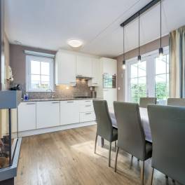 De moderne open keuken is uitgerust met diverse inbouwapparatuur en sluit naadloos aan op de eethoek en woonkamer. Extra sfeer wordt gecreëerd door de sfeervolle gashaard in de keuken, waardoor dit een heerlijke plek is om uitgebreid te tafelen of na te genieten van een dag aan zee.
