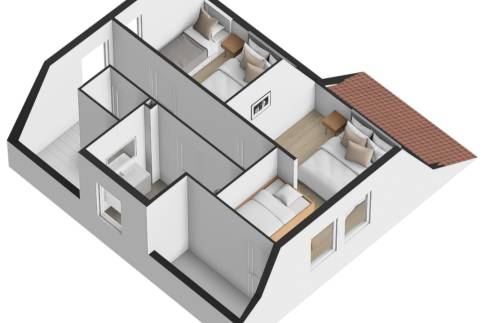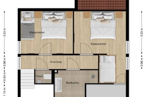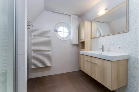 De verdieping beschikt over een royale overloop die toegang geeft tot twee ruime slaapkamers, een apart toilet en een luxe badkamer. Deze badkamer is stijlvol afgewerkt en voorzien van een inloopdouche, wastafelmeubel en handdoekradiator.