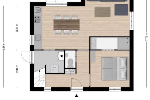 Via de entree kom je in een zeer ruime hal die toegang geeft tot de meterkast, het toilet, de trapopgang, de woonkamer en slaapkamer met badkamer en suite. In deze badkamer vinden we een douche en een wastafel. De lichte, ruime woonkamer is voorzien van vloerverwarming en staat in open verbinding met de keuken. De moderne keuken is voorzien van alle nodige en geïntegreerde inbouwapparatuur. Grenzend aan de keuken bevindt zich een bijkeuken met de cv-ketel en wasmachine.