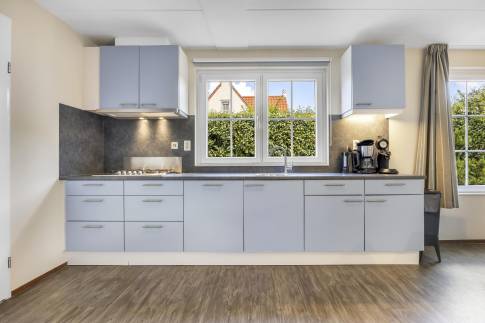 De open keuken vormt het hart van de woning en is volledig uitgerust met moderne inbouwapparatuur. Dankzij de slimme indeling is er volop werk- én opbergruimte. Aangrenzend ligt de praktische bijkeuken met witgoedaansluitingen en een extra deur naar buiten – ideaal na een dag op het strand.