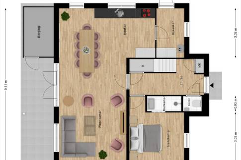 – Extra opslagruimte: Aangebouwde houten berging voor fietsen en tuingereedschap.