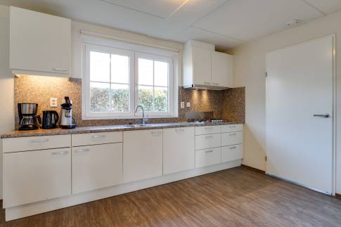 De ruime open keuken is voorzien van alle benodigde inbouwapparatuur en biedt volop opberg- en werkruimte. Aangrenzend bevindt zich de praktische bijkeuken, compleet met witgoedaansluitingen en zowel van binnen als buiten toegankelijk.