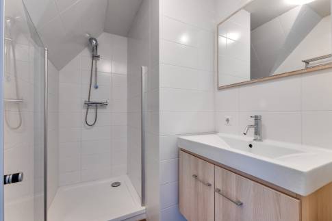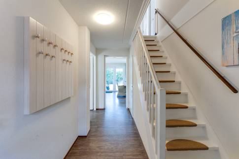 Bij binnenkomst in deze woning word je verwelkomd in een ruime hal die toegang biedt tot diverse vertrekken. Hier vind je de trapopgang met privékast, de meterkast, een modern toilet en een eerste slaapkamer met badkamer en suite. Deze comfortabele slaapkamer is uitgerust met een inloopdouche en een stijlvol wastafelmeubel – ideaal voor gasten of als eigen slaapkamer op de begane grond.