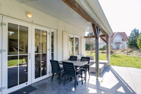 De royale woonkamer baadt in natuurlijk licht dankzij de grote openslaande tuindeuren, die direct toegang geven tot het overdekte terras – de perfecte plek om het hele jaar door te genieten van de buitenlucht.