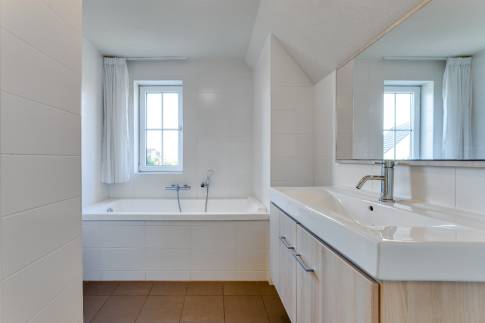 Wanneer je de trap omhoog neemt, kom je op een ruime overloop die toegang biedt tot vier royale slaapkamers, drie badkamers en een apart toilet. Ideaal voor een groot gezelschap!