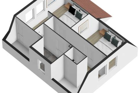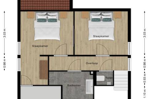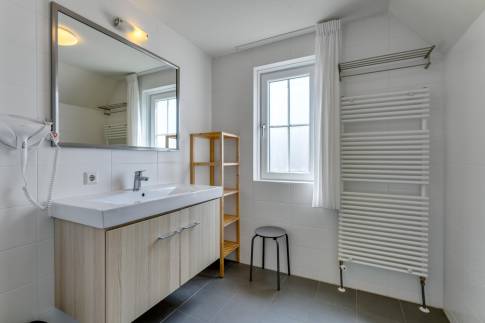 De bovenverdieping verrast met zijn royale indeling en comfortabele sfeer. Via een ruime overloop heb je toegang tot twee fijne slaapkamers, een apart toilet en een moderne, stijlvol afgewerkte badkamer met inloopdouche, glazen wand, wastafelmeubel en handdoekradiator. De grootste slaapkamer beschikt bovendien over een handige privékast – ideaal voor het netjes opbergen van kleding en persoonlijke bezittingen.