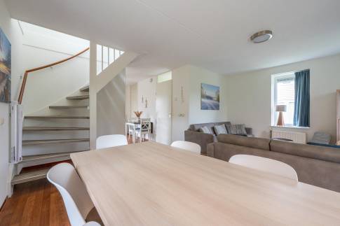 De ruime woonkamer is sfeervol ingericht met een nieuwe eettafel en comfortabele zithoek. Dankzij de openslaande deuren stap je zo de zonnige, kindvriendelijke achtertuin in – perfect voor een ontbijtje in de zon, een gezellige barbecue of gewoon lekker ontspannen met een goed boek.