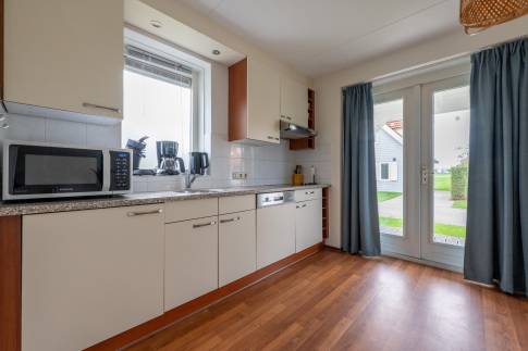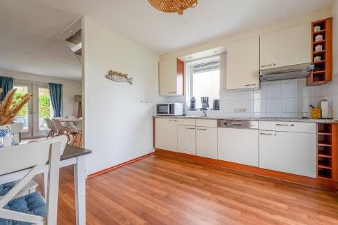 De open keuken is volledig uitgerust met moderne apparatuur en voldoende kastruimte. Samen met de eethoek vormt deze de ideale plek om te koken, eten en bij te praten.
