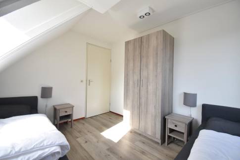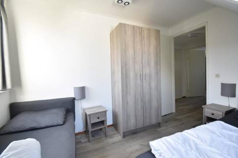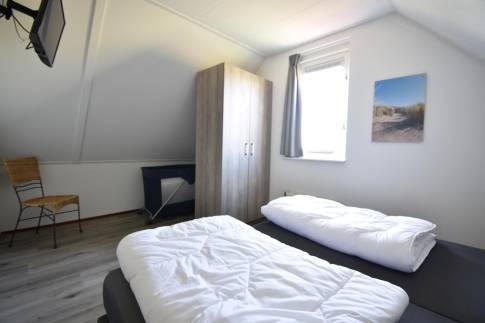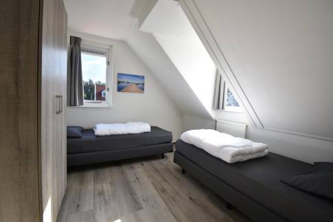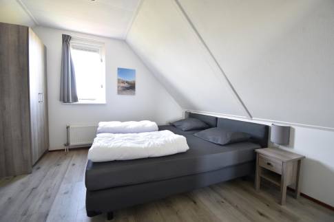 Deze woning heeft 3 ruime slaapkamers (6 pers) die zich allen op de eerste verdieping bevinden. Ook in de slaapkamers zijn de ramen voorzien van dubbelglas met ventilatieroosters. Boven bevindt zich ook een t.v. aansluiting. De badkamer voorziet in een douchegelegenheid met douchedeuren, toilet, radiator, en een wastafelmeubel met spiegelkast. Uiteraard is ook hier een raam aanwezig voor het ventileren van deze ruimte.