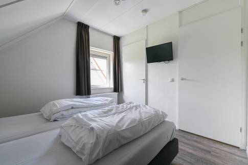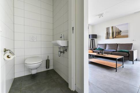 De gehele begane grond is voorzien van vloerverwarming, wat niet alleen comfortabel aanvoelt maar ook bijdraagt aan de strakke, moderne uitstraling van het interieur. Aangrenzend aan de keuken bevindt zich een praktische bijkeuken, uitgerust met een wasmachine en droger – ideaal voor een langer verblijf of als je het gemak van thuis niet wilt missen tijdens je vakantie.