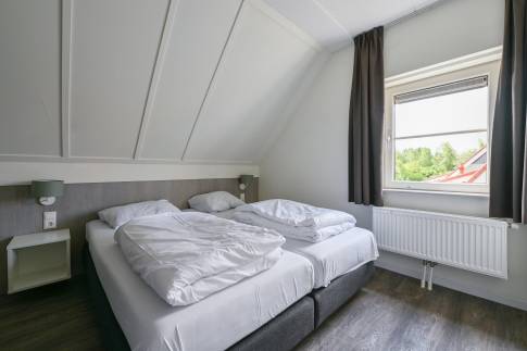 Op de bovenverdieping bevinden zich twee royale slaapkamers, elk met voldoende ruimte en comfort voor een ontspannen verblijf. De hoofdslaapkamer is stijlvol ingericht en beschikt over een eigen en-suite badkamer, voorzien van een moderne inloopdouche en een strak wastafelmeubel – ideaal voor extra privacy en gemak.