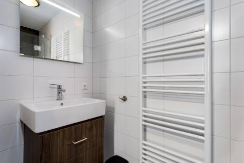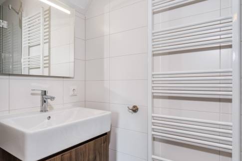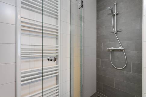 • Badkamers voorzien van stortdouches, siertegel-achterwanden, vaste wastafelkasten en thermostaatkranen