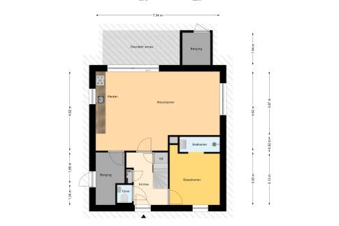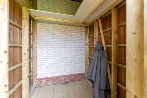 Het overkapte terras grenst direct aan de woning en vormt een fijne overgang tussen binnen en buiten. Hier zit je beschut op koelere dagen en geniet je in de zomer van de verkoelende schaduw, met uitzicht op het groen rondom je. De aangebouwde houten berging biedt volop opbergruimte voor fietsen, tuinmeubilair, speelgoed of andere spullen – praktisch én netjes uit het zicht gehouden.
