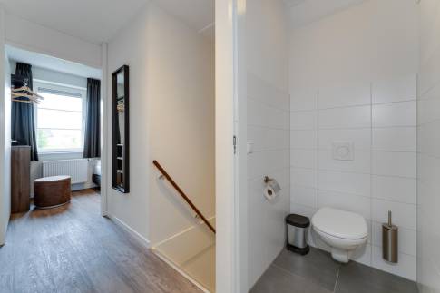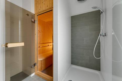 Op de eerste verdieping kom je via de overloop bij drie verrassend ruime slaapkamers, elk met voldoende lichtinval en opbergruimte. Eén van de slaapkamers beschikt over een moderne badkamer en suite met inloopdouche en wastafel, wat extra privacy biedt voor bewoners of gasten. Daarnaast is er op deze verdieping een derde, luxe uitgevoerde badkamer, uitgerust met een inloopdouche, een heerlijke sauna en een wastafel – een fijne plek om tot rust te komen na een stranddag of lange wandeling. Een tweede separaat toilet op de overloop maakt het geheel compleet en zorgt voor extra gemak tijdens het verblijf van meerdere personen.