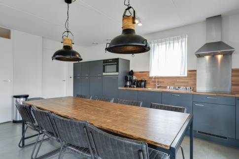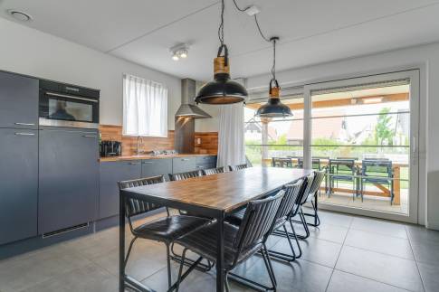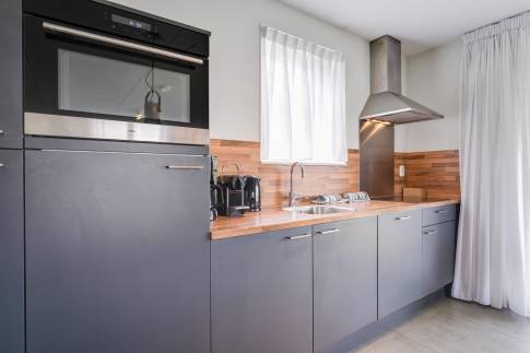 De woonkamer is een heerlijke, lichte leefruimte waar sfeer en comfort samenkomen. Dankzij de grote raampartijen en de schuifpui naar het overdekte terras vloeien binnen en buiten moeiteloos in elkaar over – perfect om op zomerse dagen te genieten van het buitenleven. De open keuken sluit naadloos aan op de woonkamer en is voorzien van hoogwaardige, geïntegreerde inbouwapparatuur. Hier kook je met gemak een uitgebreid diner of een snelle lunch. Grenzend aan de keuken bevindt zich een handige bijkeuken met wasmachine, wasdroger en extra opbergruimte – praktisch ingedeeld en uit het zicht.