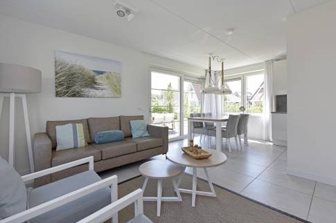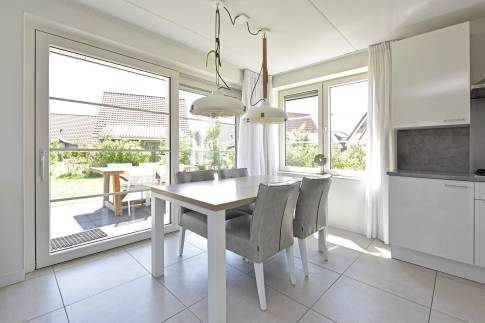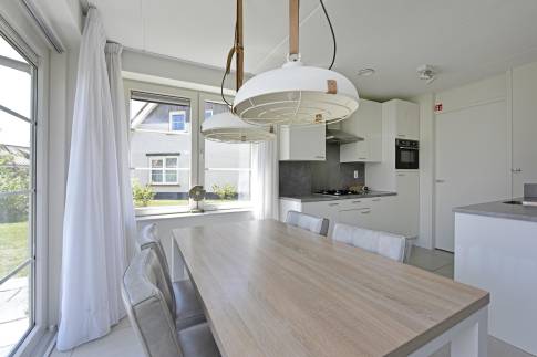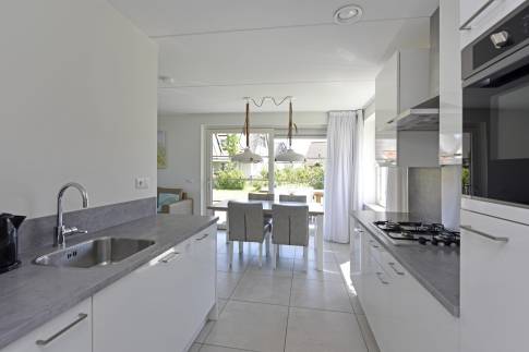 De woonkamer is licht en sfeervol, mede dankzij de grote schuifpui naar het terras. De open keuken sluit naadloos aan en is voorzien van moderne, ingebouwde apparatuur – strak afgewerkt en van alle gemakken voorzien.