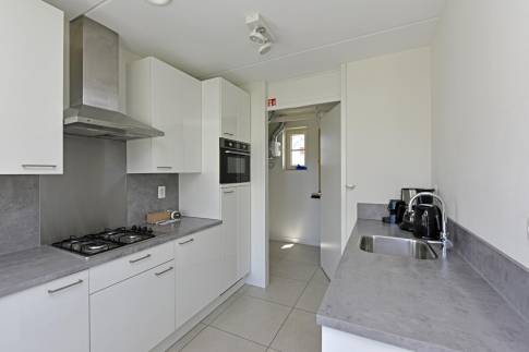 Aangrenzend bevindt zich een praktische bijkeuken met wasmachine en droger – handig voor opslag en huishoudelijk gebruik.