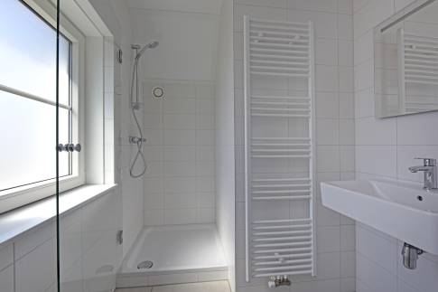Boven kom je uit op een ruime overloop die toegang geeft tot twee fijne slaapkamers. De hoofdslaapkamer heeft een eigen badkamer met inloopdouche en moderne wastafel.