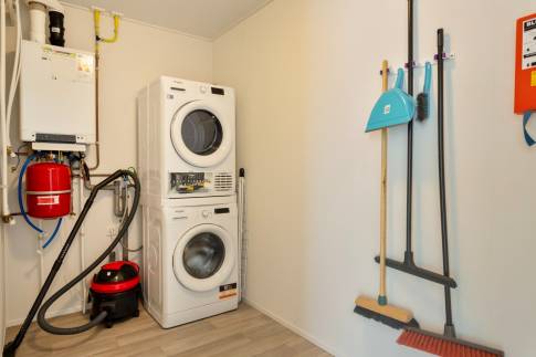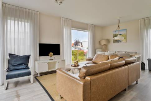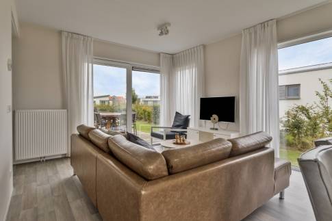 Via de entree kom je in de hal die toegang geeft tot het gastentoilet, drie slaapkamers, de badkamer, de woonkamer en een inpandige berging. De lichte en ruime woonkamer met schuifpui naar het terras staat in open verbinding met de keuken. Deze moderne keuken in rechte opstelling is voorzien van alle nodige en geïntegreerde inbouwapparatuur zoals een afzuigkap, vaatwasmachine, 4 pits gaskookplaat, koelkast met vriesvak en een combimagnetron. De badkamer is uitgerust met een inloopregendouche, wastafel met meubel en design handdoekradiator.