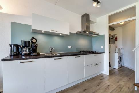 Wanneer we de woning binnen komen geeft de hal ons toegang tot de meterkast, een toilet, de badkamer en de woonkamer. De badkamer is uitgerust met een douche en een wastafel. Wanneer we naar de woonkamer doorlopen vinden we een gezellige zithoek met zicht op de fijne tuin. De grote schuifpui geeft toegang tot het aanliggende terras. De aangrenzende open keuken is voorzien van alle benodigde apparatuur. Denk hierbij aan een 4 pits- gaskookplaat en een afzuigkap. In de ruime berging vinden we nog een combi oven, koelkast en wasmachine. Tevens is hier voldoende ruimte om (voorraad)spullen op te bergen.