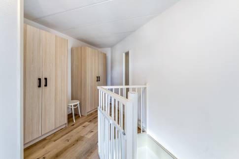 Via de wenteltrap in de woonkamer kom je op de eerste verdieping. De overloop geeft toegang tot twee ruime slaapkamers. Beide slaapkamers zijn voorzien van grote dakramen waardoor veel natuurlijk licht naar binnen valt. Op de overloop is voldoende ruimte om grote kasten te plaatsen