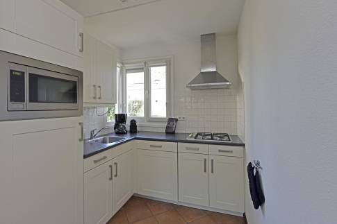 De volledig uitgeruste keuken met witte kasten en moderne inbouwapparatuur biedt alle comfort voor zelfvoorzienend verblijf.