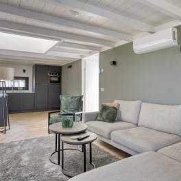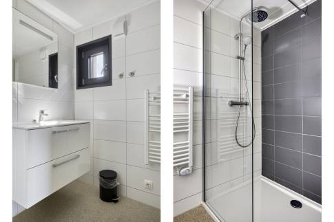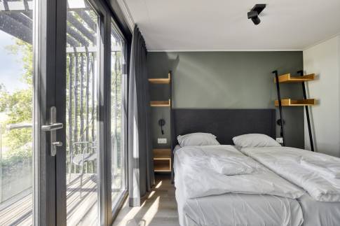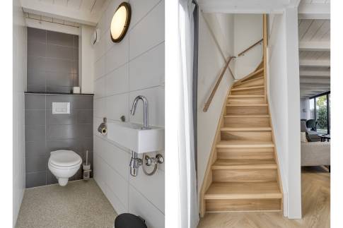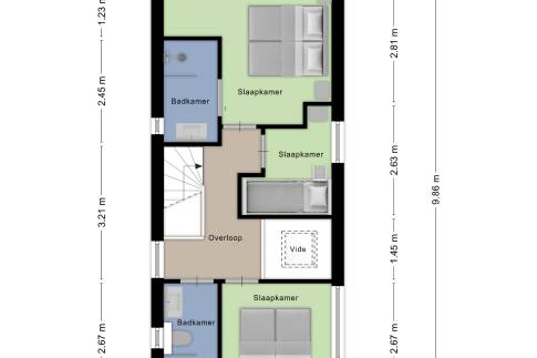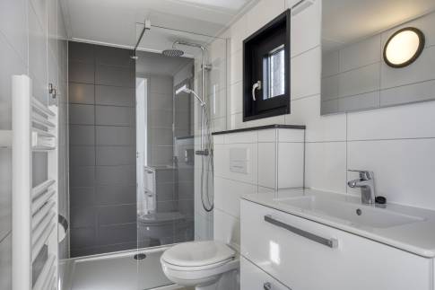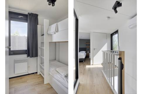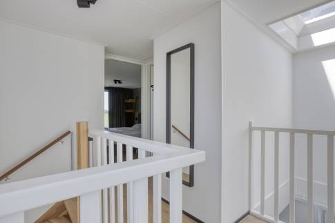 Op de bovenverdieping bevinden zich drie slaapkamers. De grootste slaapkamer heeft een aangrenzende badkamer met inloopdouche en biedt toegang tot het balkon. In deze kamer is ook voldoende ruimte voor het plaatsen van een campingbedje. De tweede badkamer is bereikbaar via de overloop en is eveneens voorzien van een inloopdouche.
