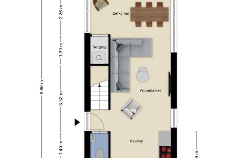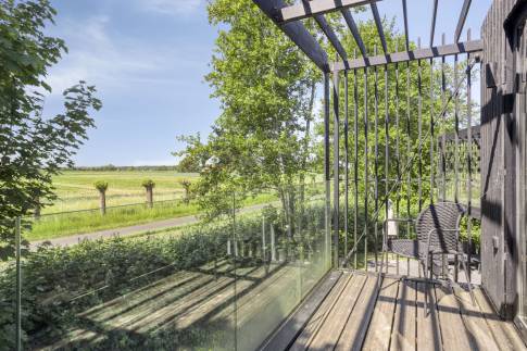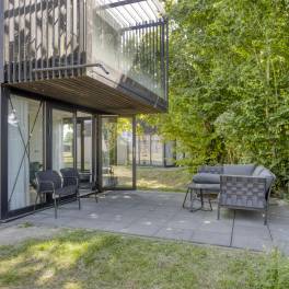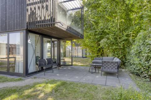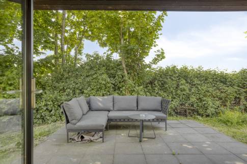 Via de woonkamer is er toegang tot het overdekte terras, dat is ingericht met tuinmeubilair. Het balkon op de bovenverdieping zorgt voor een aangename overkapping van het terras.