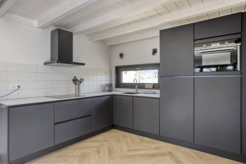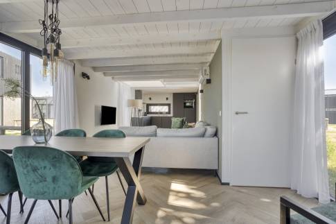 De lodge beschikt over een lichte woonkamer met vloerverwarming en een open keuken die volledig is uitgerust met onder andere een combimagnetron, vaatwasser, kokendwaterkraan en een koffiecupapparaat. Op de begane grond bevindt zich tevens een separaat toilet.
