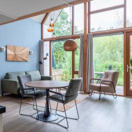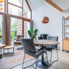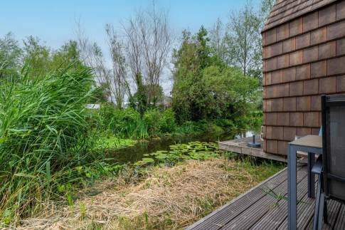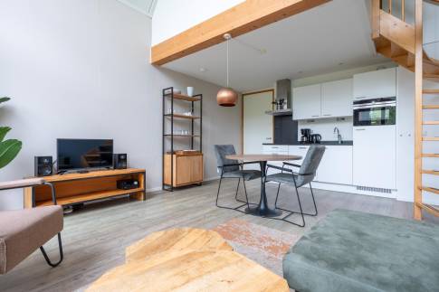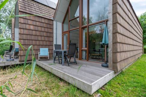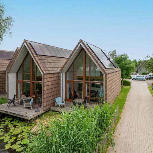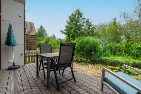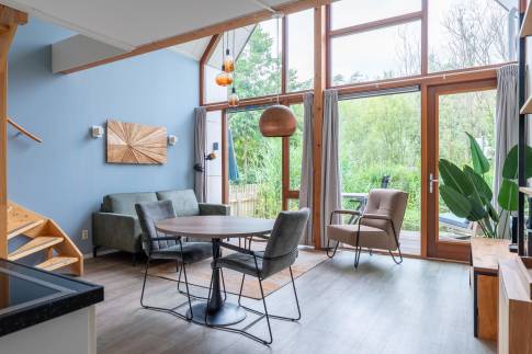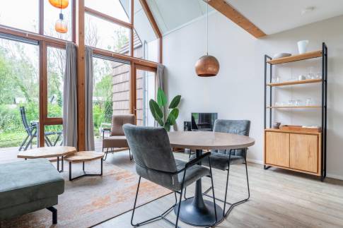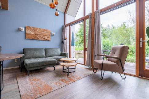 Deze luxe 2-persoonswoning, type 2L, is een heerlijk verblijf direct aan het water. Dankzij de hoge raampartijen geniet de woning van veel natuurlijk licht. De woonkamer heeft een hoog plafond en biedt direct toegang tot het terras.