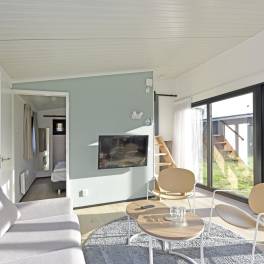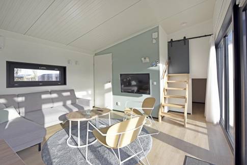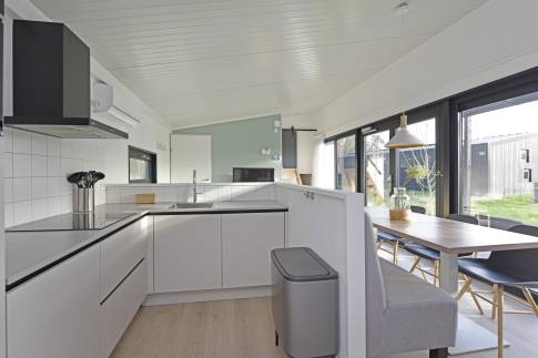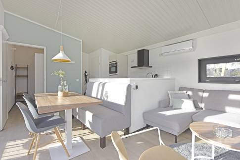 Deze sfeervolle, vrijstaande lodge biedt gelijkvloers wonen en is geschikt voor maximaal 6 personen. De woning heeft een ruime en lichte woonkamer met comfortabele zithoek, grote eettafel en vloerverwarming, waardoor het ook in de koelere maanden aangenaam vertoeven is. De open keuken is volledig uitgerust met een vaatwasser, combimagnetron, koelkast met vriesvak, kokendwaterkraan en een koffiezetapparaat voor Nespresso-cups.