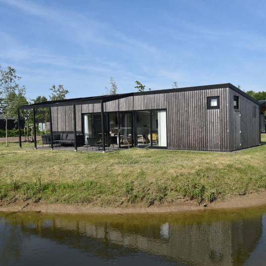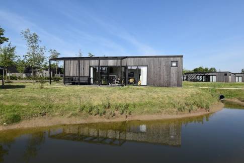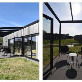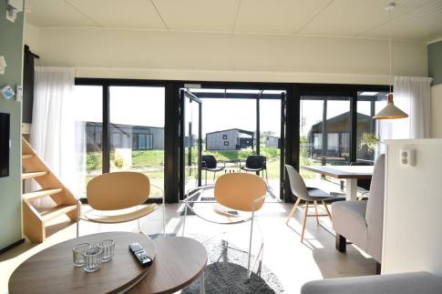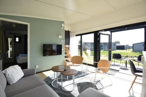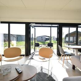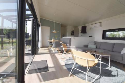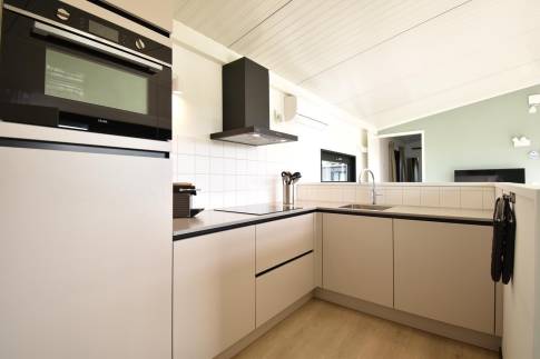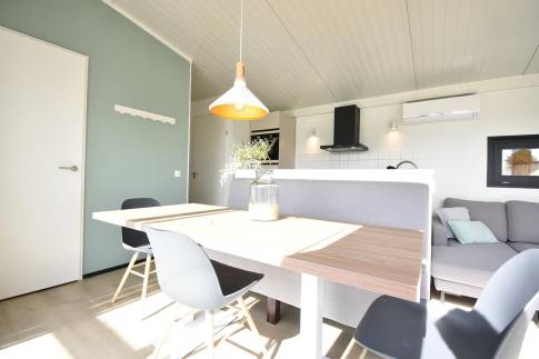 De lichte woonkamer met grote glazen pui en openslaande deuren naar het terras zorgt meteen voor dat fijne vakantiegevoel. Binnen en buiten lopen hier moeiteloos in elkaar over. De gezellige eethoek en open keuken maken dit dé plek om samen te koken, eten en ontspannen. Dankzij de energiezuinige elektrische verwarming zit je hier altijd behaaglijk.