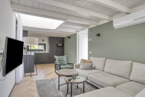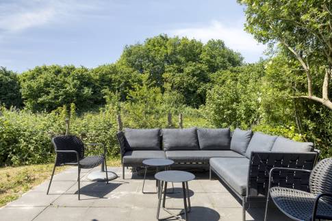 De lichte woonkamer met grote raampartij, openslaande deuren én een lichtkoepel zorgt voor een aangename, zonnige sfeer.