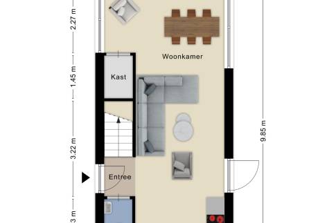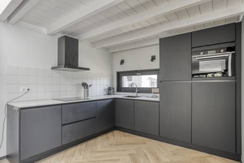 De aangrenzende eetkamer biedt plek voor gezellige diners, terwijl de open hoekkeuken – volledig uitgerust – het hart van het huis vormt.