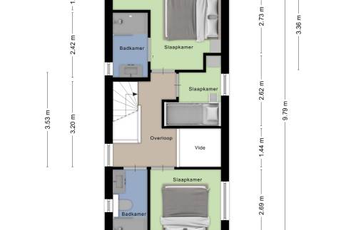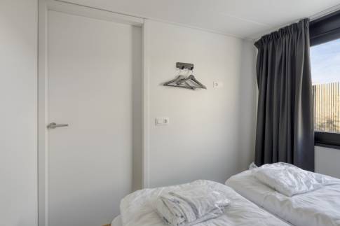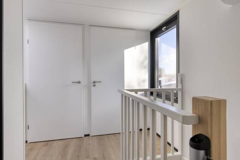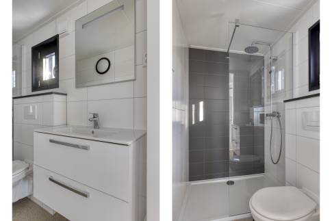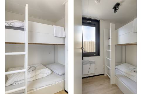 Op de verdieping bevinden zich drie slaapkamers. Twee slaapkamers zijn ingericht met elk twee eenpersoonsbedden. De derde slaapkamer beschikt over een stapelbed en is daarmee ideaal voor kinderen. De grootste slaapkamer heeft een eigen aangrenzende badkamer en directe toegang tot het balkon. Hier is bovendien voldoende ruimte voor het plaatsen van een campingbedje. De tweede badkamer is bereikbaar via de overloop. Beide badkamers zijn voorzien van een moderne inloopdouche.