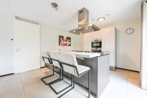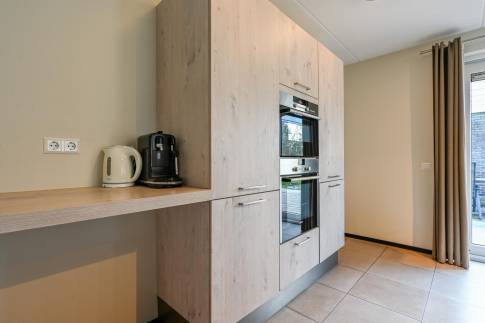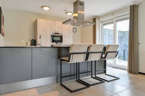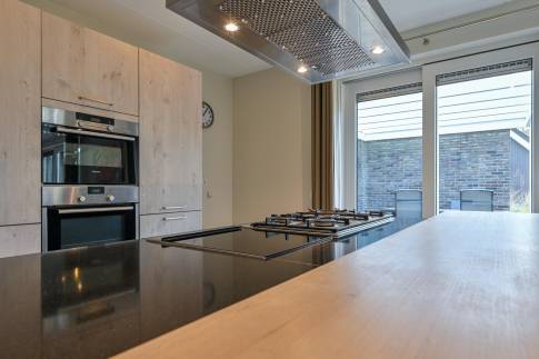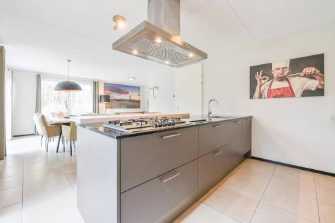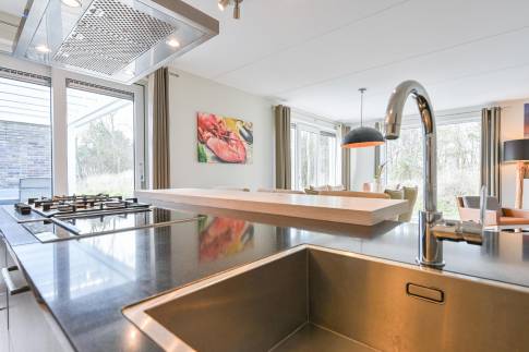 De keuken is een perfect voor kookliefhebbers. Het centrale kookeiland is namelijk ingericht met een 5-pits gasplaat en teppanyaki-plaat. Daarnaast is de keuken uitgerust met een combimagnetron, oven, vaatwasser en een extra grote koelkast met apart vriesvak.