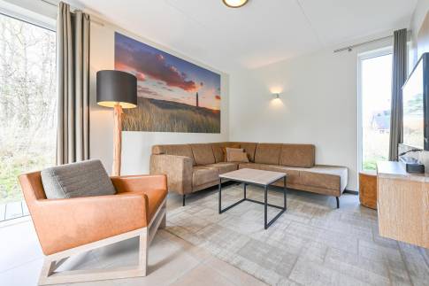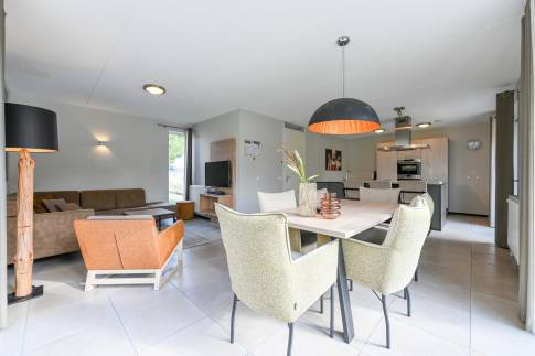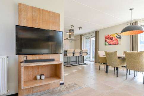 Bij binnenkomst ervaar je direct de warme en stijlvolle inrichting van de woon-/eetkamer. De zithoek is voorzien van een LED flatscreen-tv, een soundbar en Chromecast, ideaal voor een ontspannen avond met je favoriete series of muziek. De eethoek biedt voldoende ruimte om samen te genieten van een heerlijke maaltijd.