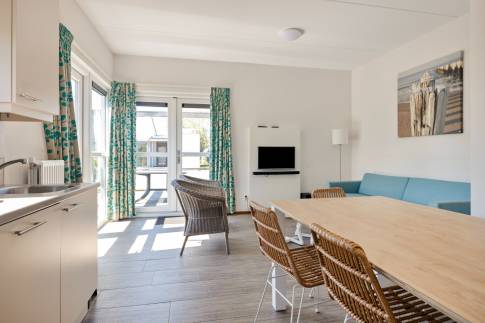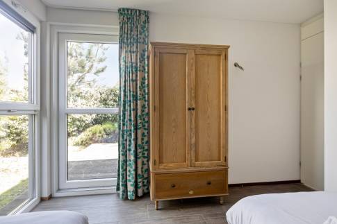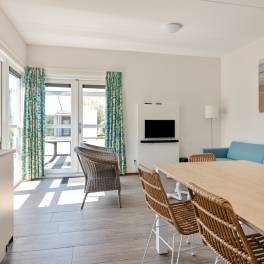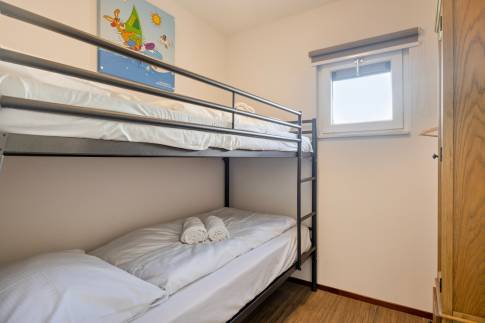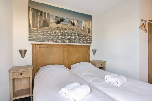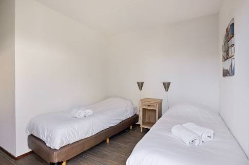 Daarnaast zijn er 3 slaapkamers, waarvan 2 met elk 2 eenpersoons boxspringbedden en 1 slaapkamer met stapelbed. Eén slaapkamer heeft een eigen tv. Verder zijn er 2 badkamers, waarvan 1 met een ligbad en 1 met een douche en in de hal is een apart toilet. Ook is de woning uitgerust met een gemeubileerd terras, met tuintafel en tuinstoelen.
