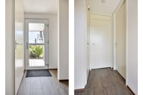 Deze vrijstaande bungalow oogt ruim door het hoge planfonds in de woonkamer en grote raampartijen met uitzicht op en toegang tot het op het zuid en westen georiënteerde terras. De gehele bungalow is voorzien van vloerverwarming.